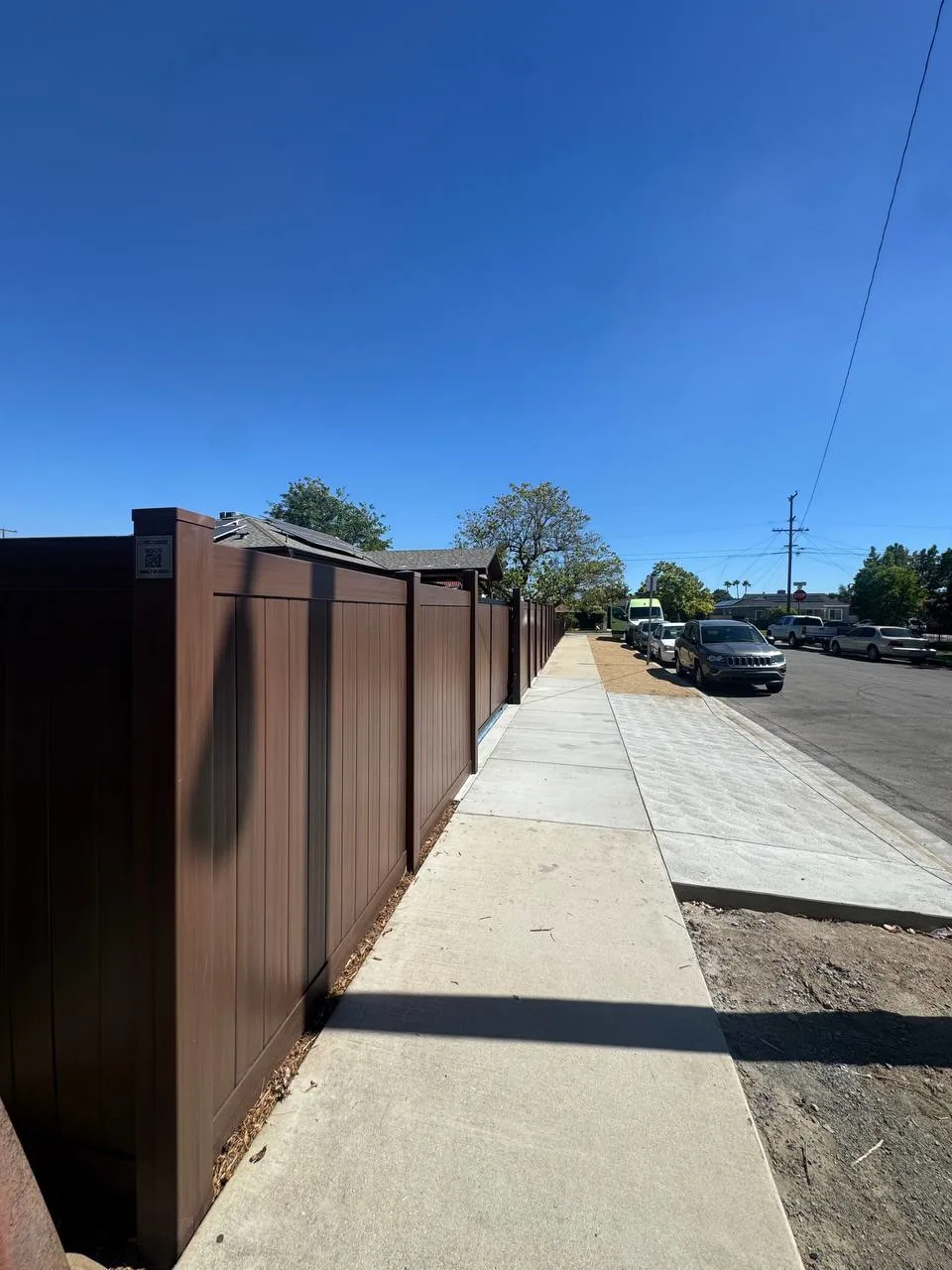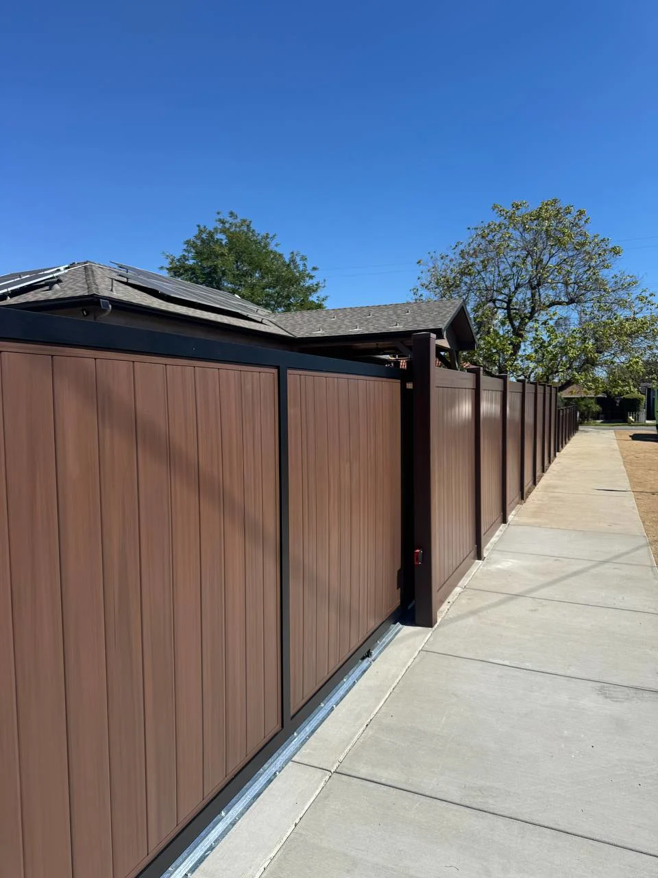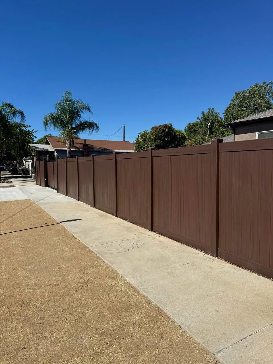 We installed a 6-foot full privacy vinyl fence in Dark Sequoia along the main perimeter.