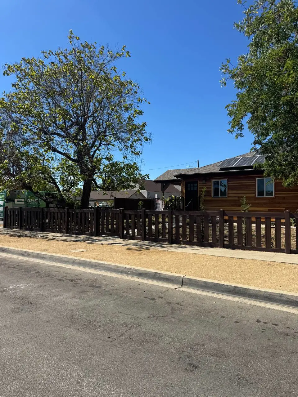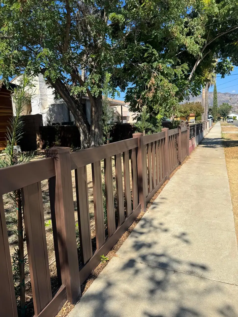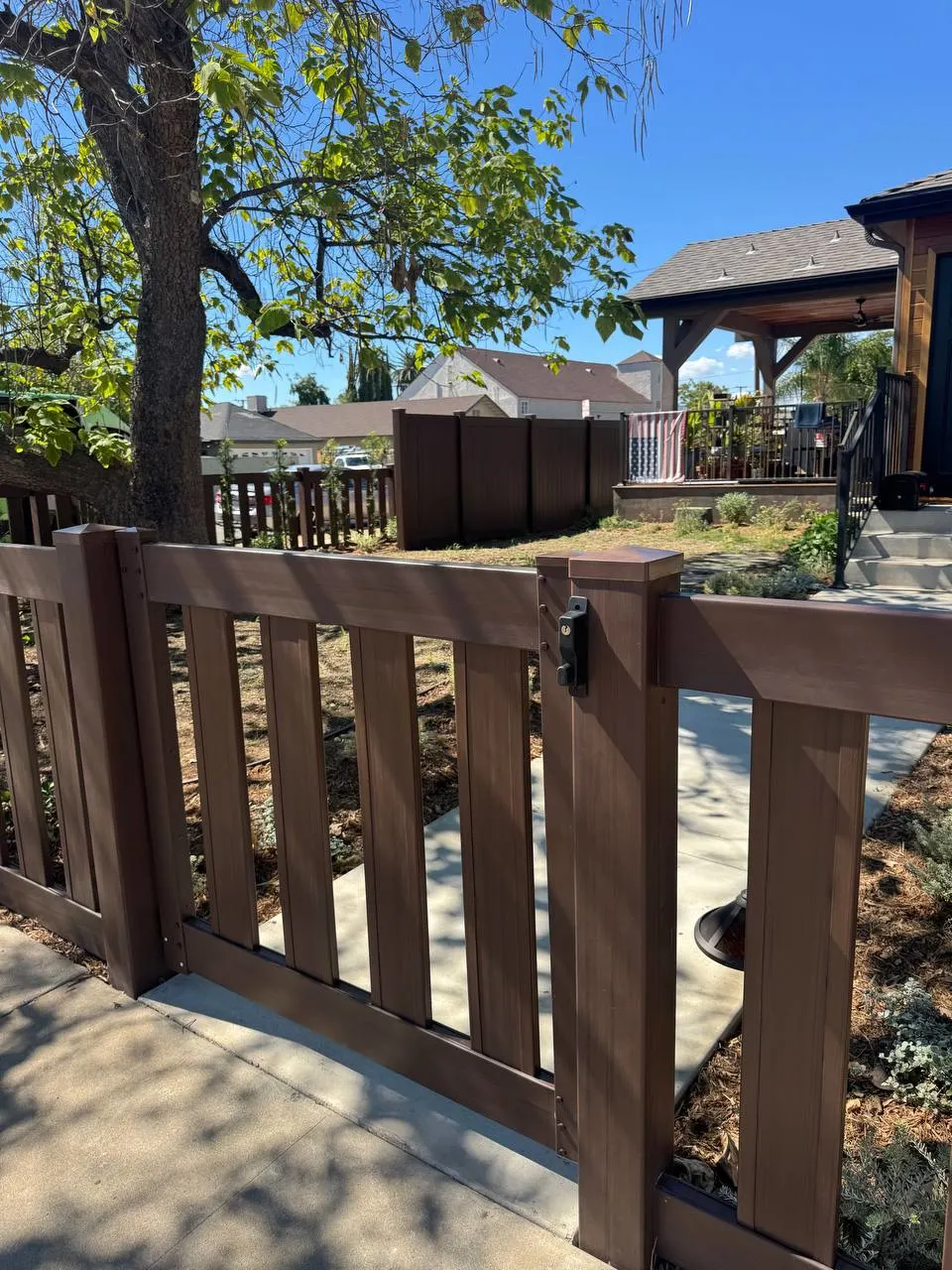 We installed a 6-foot full privacy vinyl fence in Dark Sequoia along the main perimeter.
