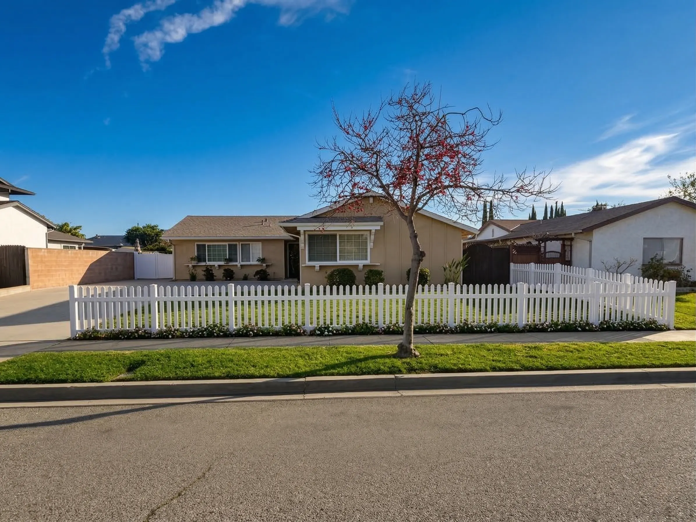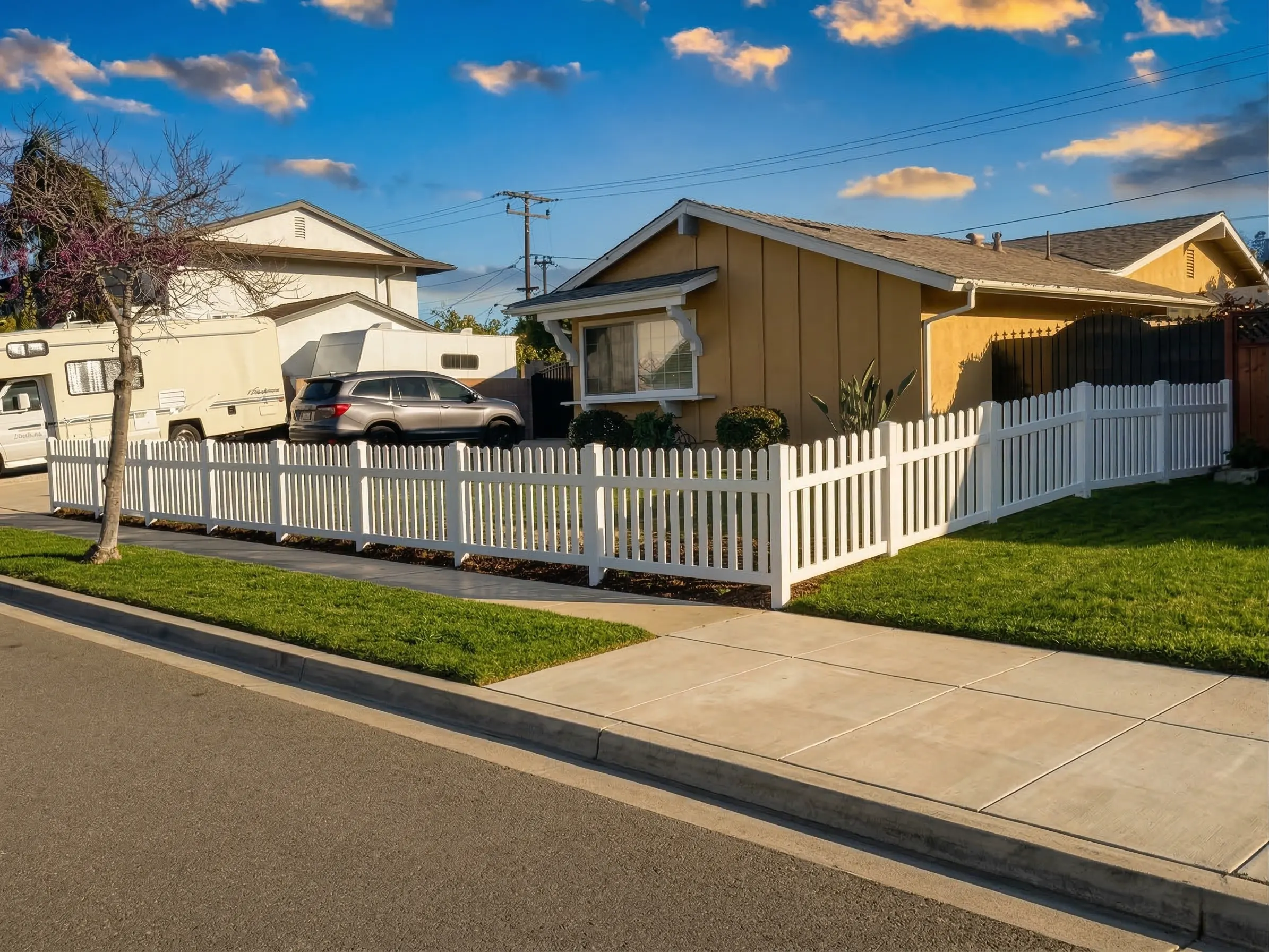 This project involved installing a white vinyl picket fence around the front yard of a residential property in Simi Valley. The homeowner wanted to define the property line while maintaining an open, welcoming appearance that fits the neighborhood’s suburban character. A classic picket design was selected to frame the yard without blocking views of the home or landscape, creating a clean and balanced look along the street corner.