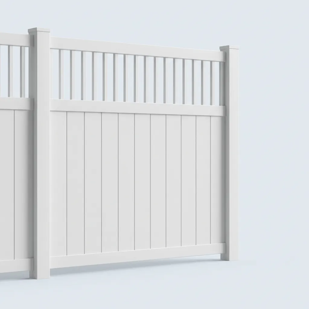 Financing AvailableThis white aluminum vertical privacy fence panel with a vertical picket top offers a practical and sophisticated solution for property boundaries. Measuring 2 feet in height and 8 feet in width, the low-profile design is particularly suited for garden perimeters, patio enclosures, or as an ornamental addition to existing retaining walls. The combination of solid privacy slats and an open picket top creates a balanced look that provides security without feeling overly restrictive. The clean white finish is applied through a professional powder-coating process, ensuring the color remains bright and consistent across the entire 8-foot span. This specific sizing allows for efficient coverage of long runs while maintaining a clear view of the surrounding landscape above the fence line.