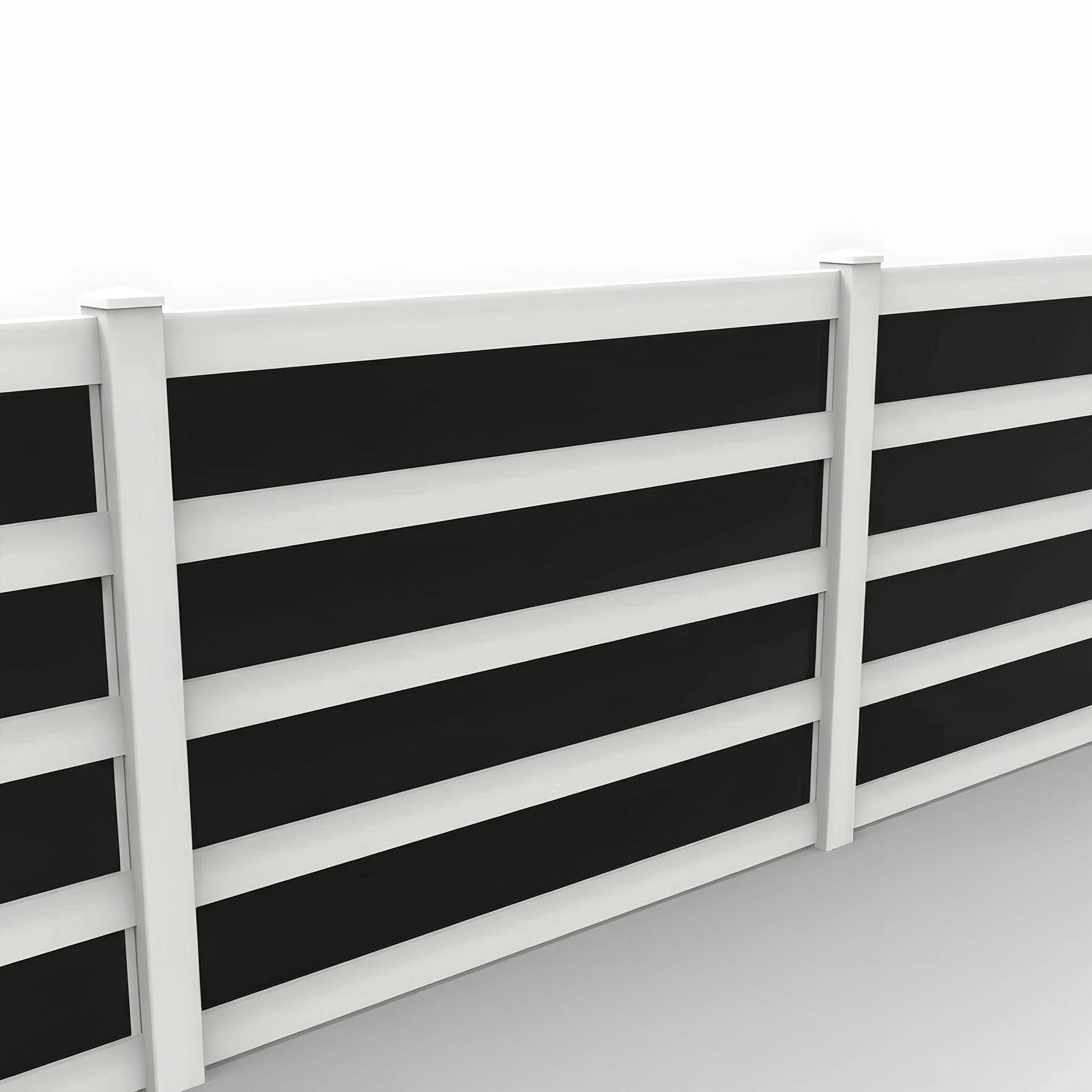This 6ft tall, 8ft wide vinyl and acrylic privacy fence panel creates a substantial visual screen for backyards or patio spaces. The solid vertical sections block noise and views from neighbors, making it an effective choice for defining quiet, private areas. Above the solid base, the white acrylic top insert allows light through without sacrificing security, preventing the heavy, closed-in feeling common with full privacy fences.