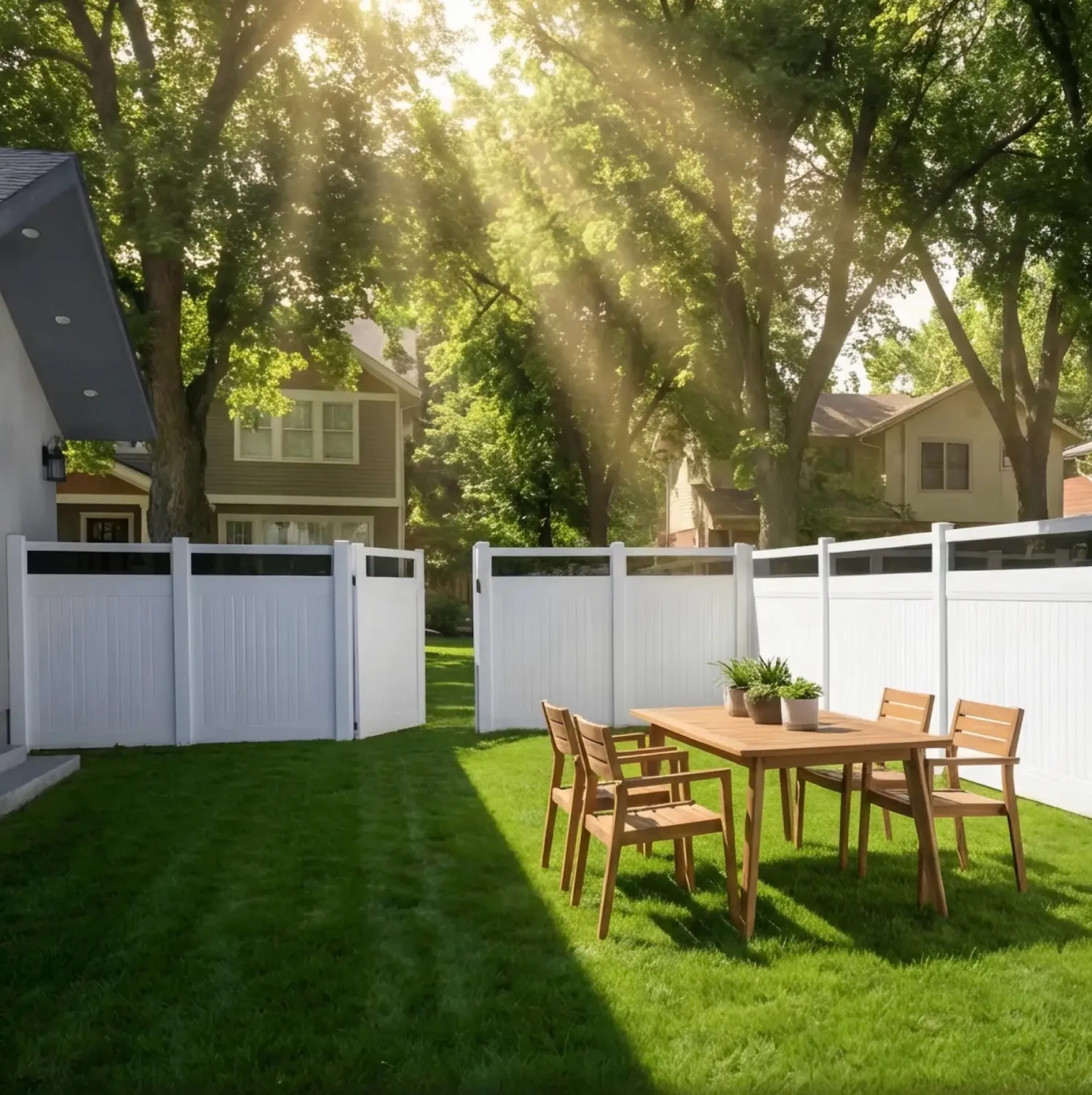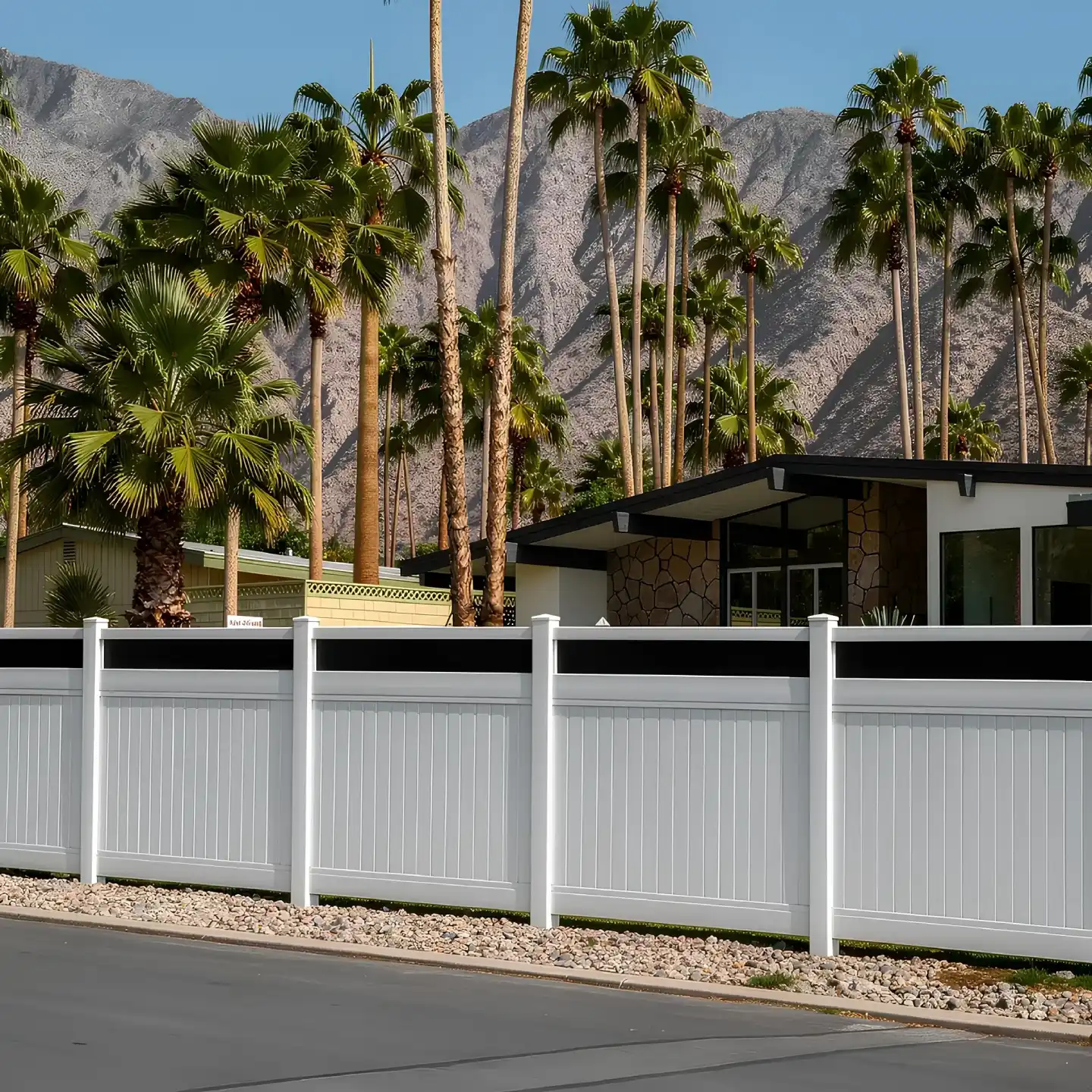 Our vertical vinyl privacy fence with an acrylic top is a practical choice. The lower section of the fence is fully enclosed with vertical vinyl panels, while the upper section features an acrylic top panel that adds visual openness to the design.